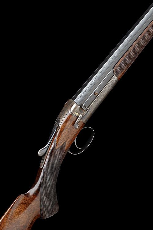 24 3/4in. nitro reproved turned round to octagonal barrel with matt top flat, leaf sights removed and dovetail insert, breech end engraved 'HOLLAND & HOLLAND. 98 NEW BOND ST. LONDON. .250 SEMI SMOOTH BORE WINNERS OF ALL THE 'FIELD' RIFLE TRIALS. PATENT NO. 1294', 2 1/2in. chamber, bored approx. true cyl. choke, H.W. Holland patent lever-cocking action, patent no. 1294 of 17th March 1882, carved teardrop fences, manual side lever safety with gold-inlaid 'SAFE' detail, border and acanthus scroll engraving, retaining traces of original colour-hardening and finish, 13 5/8in. figured pistolgrip stock with steel pistolgrip-cap and buttplate, Hackett snap fore-end with horn finial, weight 4lb. 1oz.