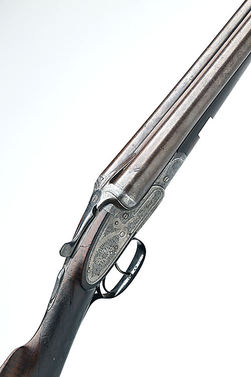 J.S. BOREHAM 12-BORE SIDELOCK EJECTOR, n.v.s.n., 28in. nitro reproved damascus barrels (bore measurements marginal), 2 1/2in. chambers, bored approx. true cyl. and full choke, treble-grip action, carved serpentine fences, automatic safety, border and acanthus scroll engraving, 13 1/2in. stock including buttplate, weight 6lb. 10oz., in a leather leg of mutton guncase