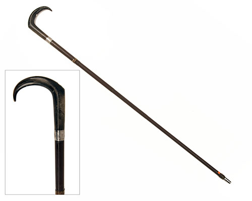 French, circa 1910, with 26in. browned iron barrel, screw-off loading action with concealed pull-back hammer (cocking tool missing), engraved band with make and serial number details (No. 2401 applied at proof), crooked horn handle with provision for shoulder-stock (missing), 36 1/2in. overall including tapering iron muzzle-plug