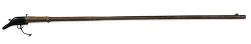 circa 1900, with brown painted 99 1/4in. barrel, ramp fore-sight, twin 'cotton-reel' side trunnions, dark walnut tiller butt opening on a swing-bolt, central pull-back cocking piece and guarded trigger, 110 1/2in. overall, with spare firing pin assembly and assembly tool