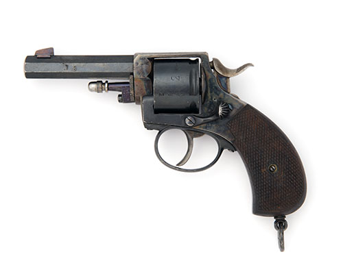 Belgian for the Dutch market circa 1890, with blued octagonal 3 1/2in. barrel, the right hand top-flat signed 'NED WAPPENMAGAZIJN-HAARLEM', the left top-flat continuing 'HAAG-AMSTERDAM-ARNHEM', the top-flat itself marked 'ACIER FONDU', dove-tailed blade fore-sight, plain blued cylinder marked '1-2' with an arrow, colour-hardened solid frame with hinged loading gate and blued cylinder locking side-safety, chequered walnut birds-head grips with lanyard ring at heel, colour-hardened spurred hammer and guarded trigger, swing-out ejector, much original finish throughout