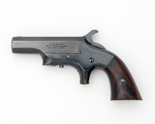 manufactured by Brown Manufacturing Co. U.S.A. circa 1869-73, with octagonal 2 3/8in. sideways-swinging barrel, the top-flat marked 'SOUTHERNER', blade fore-sight, iron frame with push-button barrel lock, smooth wood grips and sheathed trigger, the whole reblued