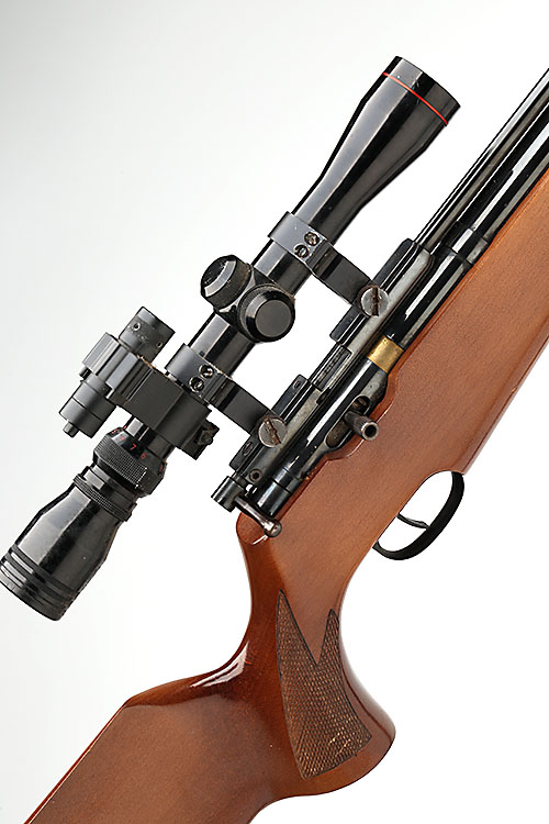 A .22 PRE-CHARGED PNEUMATIC AIR-RIFLE SIGNED FALCON, MODEL 'MC020', serial no. 90985, mid 1990's, with blued floating barrel, blued air-chamber, beech right-handed stock and fitted with an unsigned 3-9x32 telescopic sight, a laser and mounts