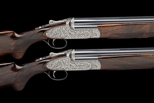 30in. nitro barrels with 7mm ventilated matt top-ribs gold-inlaid '1' and '2', 2 3/4in. chambers, bored approx. full choke in all, hold-open toplevers gold-inlaid '1' and '2', manual safeties with integral barrel selector switches and gold-inlaid 'S', '1' and '2' details, gold-washed single triggers, the action, decorative sideplates and furniture all profusely engraved with bold scrolling acanthus set against a matt background, the undersides each engraved with a vignette of a pheasant flushed from its naturalistic habitat, triggerplates signed 'PATELLI W.', 14 1/2in. figured semi-pistolgrip stocks (cracked at hand) including 3/4in. rubber recoil pads, weight 7lb. 11oz. (both), in their makers universal double motorcase