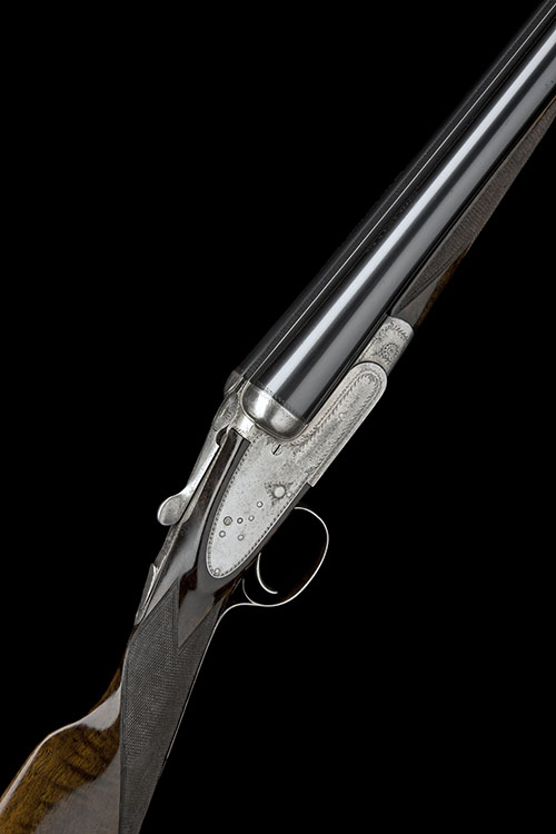 34in. nitro barrels with file-cut rib, the tubes engraved 'JOSEPH LANG & SON. 102. NEW BOND STREET. LONDON. W.', 3in. chambers, bored approx. 1/2 and 3/4 choke, treble-grip action, automatic safety with gold-inlaid 'SAFE' detail, border engraving, bright finish, 14 1/2in. figured stock including 1 1/8in. wooden extension, weight 7lb. 8oz.