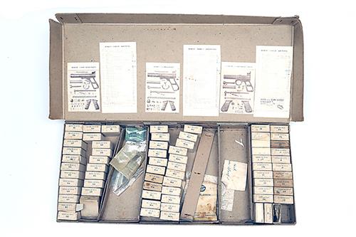 A GOOD WEBLEY & SCOTT AIR-PISTOL SPARES BOX, post war circa 1955, containing numerous small boxes of spares for the 'Senior', 'Mark I' and 'Junior' air-pistols plus the odd isolated spare for other Webley air-guns, some cartons empty, lid with one corner gone and staining