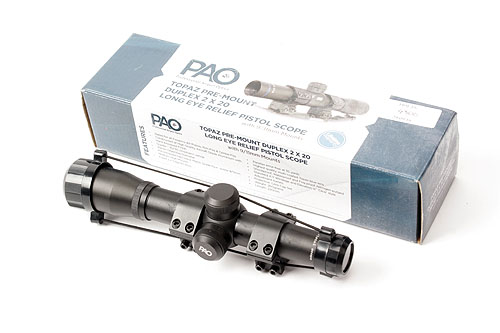 A PAO TOPAZ PRE-MOUNT DUPLEX 2X20 LONG EYE RELIEF PISTOL SCOPE