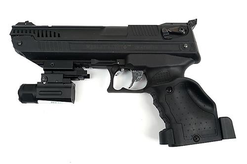 A CASED .177 SINGLE-STOKE PNEUMATIC AIR-PISTOL SIGNED WEBLEY, MODEL 'ALECTO', serial no. TRAT0611W, recent, loosely following the lines of an IMI .50 Desert Eagle, with 9in. concealed barrel, kevlar shroud and receiver, integral anatomical right hand grip and fitted with a torch and laser (batteries discharged or missing); COMPLETE WITH its makers abs plastic carry case, instructions and accessories, appearing little used