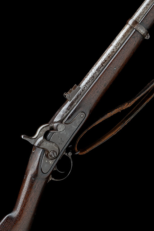 the lock dated for '1863', the barrel '1864', with 40in. rifled barrel, block and blade fore-sight, twin folding leaf with standing notch rear-sight, the breech marked '1864' (faint), plain solid top-tang, plain lock marked 'S.N. & W.T.C. FOR MASSACHUSETTS' together with an American eagle and the date, plain hammer, walnut three-quarter stock with iron furniture including three barrel bands and ramrod, fitted with a period leather sling (distressed) and complete with a 'U.S.' marked socket bayonet (no scabbard)