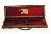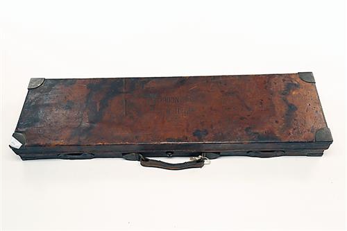 A BRASS-CORNERED OAK AND LEATHER SINGLE HAMMERGUN CASE, fitted for 30in. barrels, the interior lined with red baize, a torn E.M. Reilly & Co. trade label, brass push-button lock (key missing)