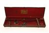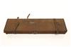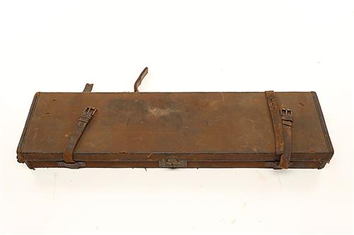 AN ARMY & NAVY CANVAS AND LEATHER SINGLE HAMMERGUN CASE, fitted for 30in. barrels, the interior lined with red baize, an Army & Navy trade label, brass butterfly lock (key missing), handle broken