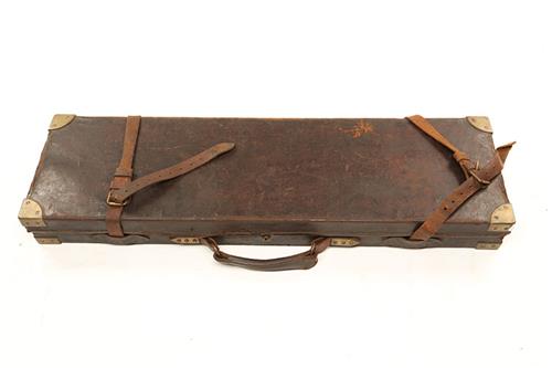 A BRASS-CORNERED OAK AND LEATHER SINGLE GUNCASE, fitted for 30in. barrels, the interior lined with green baize, central brass push-button lock (key missing)