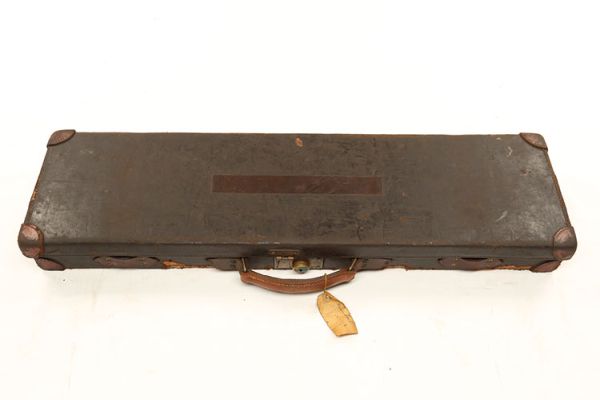 A LEATHER SINGLE GUNCASE, fitted for 30in. barrels, the interior lined with red baize, label has been cut out, brass lock (key missing)