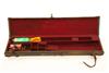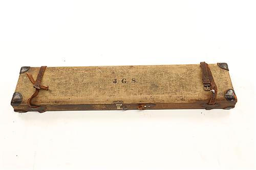 A LIGHTWEIGHT CANVAS SINGLE GUNCASE, fitted for 28in. barrels, the interior lined with red baize, brass lock (key missing), handle missing