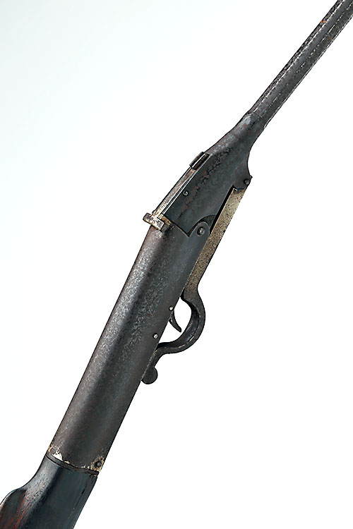 A .177 BREAK-BARREL AIR-RIFLE, UNSIGNED, MODEL 'GEM', no visible serial number, circa 1895, with octagonal 20 1/4in. barrel, 'T' bar barrel latch with '1891' patent, slanting air-chamber forming the wrist, walnut butt-stock with iron heel-plate, and cocking link forming the trigger-guard, traces of finish but corroded