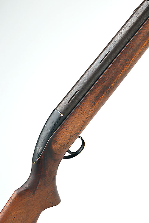 A .22 UNDER-LEVER AIR-RIFLE SIGNED BSA, MODEL AIRSPORTER MKII, serial no. GD12610, for 1959-65, with blued 18in. barrel, the fore-sight retaining its sight protector, blued air-chamber with traces of etching, two part rail for a telescopic sight, three-piece walnut stock and concealed under-lever, original finish with surface corrosion
