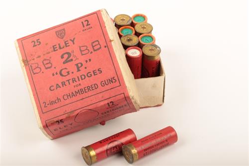 TWENTY FIVE COLLECTABLE 12 BORE 2 1/2 INCH PAPER CASED SHOTGUN CARTRIDGES comprising 19 Jeffries "Sharpshooter" with bb shot and 6 Leech & Sons with No 4 shot in a vintage Eley 2 inch GP box