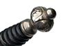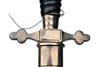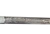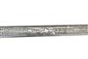 circa 1937, with double edged 13 1/4in. stiletto blade, the front etched with floral scrolls surrounding a central panel of a fire helmet, ladder and axes, the reverse similar but with a central panel of fire hoses and axes, Carl Eickhorn squirrel trademark at forte, nickel straight cross-guard with trefoil quillions, the center section with a relief carving of a fire helmet and crossed axes, black leather-bound wood grip originally with spiral wire binding, now mostly absent and carved nickel bulbous pommel; COMPLETE WITH its black leather scabbard with nickel fittings and twin suspension loops
