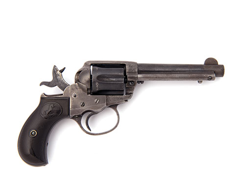 for 1899, with round tapering 4 1/2in. barrel signed on two lines 'COLT'S PT FA MFG CO HARTFORD CT USA', crescent fore-sight, sighting groove to the top-strap, cylinder with long flutes, solid iron frame with three lines of patent dates, spurred hammer, guarded trigger and chequered hard-rubber birdshead grips, minimal traces of finish, action frozen at full cock