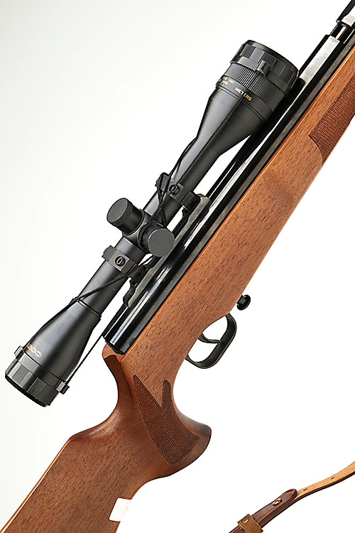 A .22 UNDER-LEVER REPEATING AIR-RIFLE SIGNED THEOBEN, MODEL 'SLR88 IMPERATOR', no visible serial number, circa 1990, with blued 16in. barrel including integral sound moderator, seven-shot magazine, blued air-chamber with integral rings for a telescopic sight, chequered walnut sporter stock and blued under-lever, COMPLETE WITH a TASCO 4x40PA telescopic sight and 'THEOBEN' sling and gunslip, all appearing little used