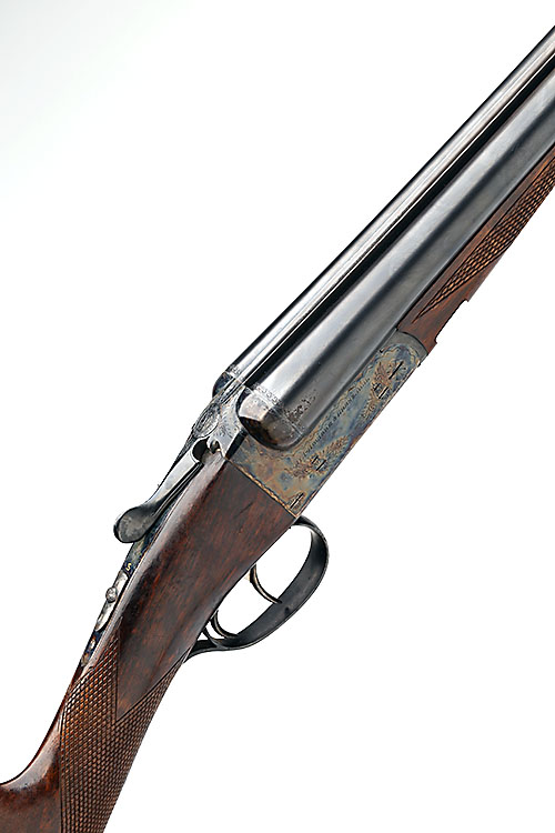 AYA 12-BORE BOXLOCK EJECTOR, serial no. 373264, 26in. nitro barrels, 2 3/4in. chambers, bored approx. 1/2 and 3/4 choke, removable striker discs, automatic safety with gold-inlaid 'S' detail, border engraving, retaining much original colour-hardening and finish, 14 3/4in. stock