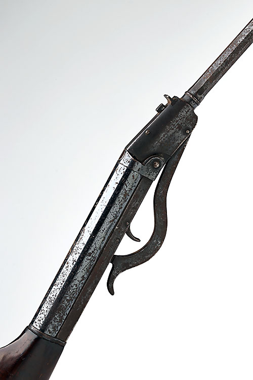 A .177 BREAK-BARREL AIR-RIFLE SIGNED 'FLZ', MODEL 'GEM', serial no. 22120, produced by langenhan, Germany circa 1920, with two-stage sighted 19in. barrel, push-button 'dolls-head' latch, blued air-chamber, walnut butt-stock and cocking link forming the trigger-guard, traces of finish