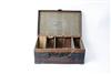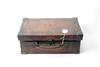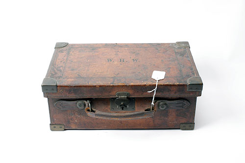 A BRASS-CORNERED LEATHER CARTRIDGE MAGAZINE, fitted for 250 cartridges, the interior lined with beige baize, four removable dividers (one missing, five leather lifters, brass lock (key missing, not working), the lid exterior with the initials 'W.H.W.'