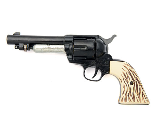 A .177 (BB) CO2-POWERED REPEATING AIR-PISTOL SIGNED 'HAHN', MODEL '45', serial no. 105619, in loose imitation of a Colt single action army, with black painted finish, 4 3/4in. barrel and imitatation staghorn grips, untested