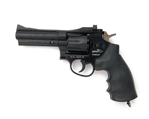 A .177 CO2-POWERED REPEATING AIR-PISTOL SIGNED GAMO, MODEL 'COMBAT', serial no. 04-5C-006439-99, with 4in. barrel, adjustable sights, 8-shot cylinder and soft rubber finger-grooved grips, untested