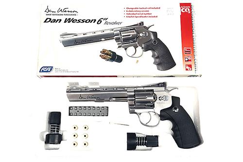 A BOXED .177 CO2-POWERED AIR-PISTOL SIGNED DAN WESSON, MODEL '6in. STAINLESS', serial no. 10B09333, with 6in. plated barrel and six-shot chamber, plated frame and soft rubber grip, in its makers carton appearing unused (untested)