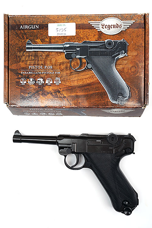 A BOXED .177 (BB) CO2-POWERED AIR-PISTOL SIGNED UMAREX, MODEL 'P08 LUGER', serial no. 13D52413, in imitation of the pistol of the same name, with 4in. barrel, blacked finish and complete with its makers carton appearing little used (untested)