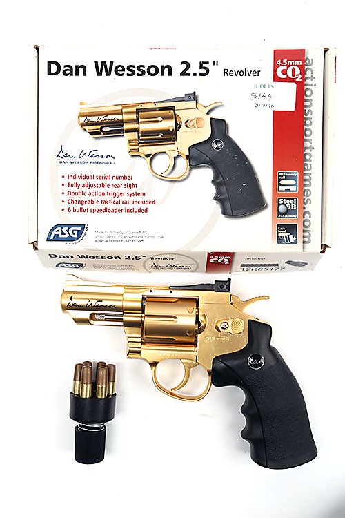 A BOXED .177 (BB) CO2-POWERED AIR-PISTOL SIGNED DAN WESSON, MODEL 2 1/2in. REVOLVER GOLD, serial no. 12K05177,