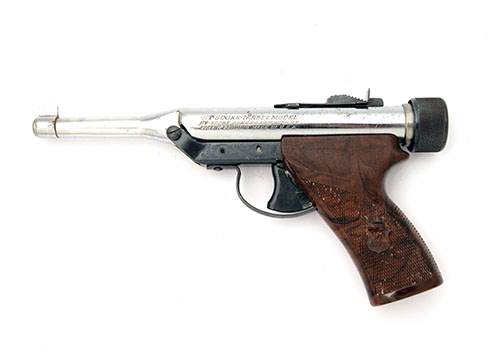 A .22 BARREL-COCKING CHROME-PLATED AIR-PISTOL SIGNED HY-SCORE, MODEL 800, no visible serial number,