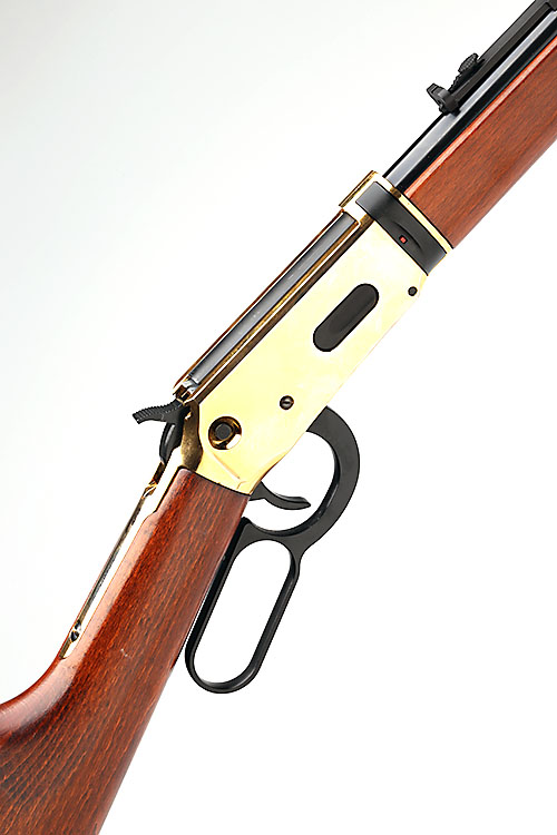 A .177 CO2 POWERED LEVER-ACTION RIFLE SIGNED WALTHER, MODEL 'LEVER-ACTION LONG GOLD', serial no. W132839913, in imitation of a Winchester lever action rifle, with sighted 19 1/2in. barrel, swing-out loading gate for 8 shot magazine (included), gold plated receiver with traces of etched design, walnut butt-stock and fore-end, untested