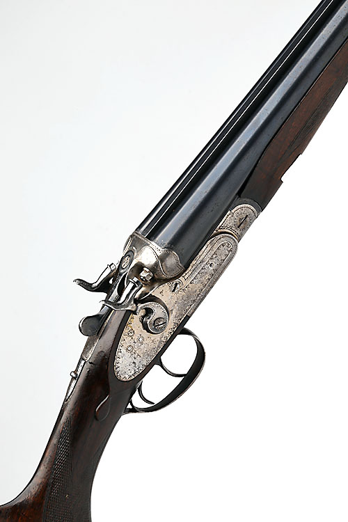 SPANISH-MADE 12-BORE SELF-COCKING TOPLEVER HAMMER EJECTOR, serial no. 78958, 27 1/2in. nitro barrels, 2 3/4in. chambers, bored approx. imp. cyl. and full choke, bolstered treble-grip action with hidden third bite, gas checks, carved percussion fences, automatic safety, border engraving, 14 1/4in. pistolgrip stock, beavertail fore-end, weight 6lb. 15oz.