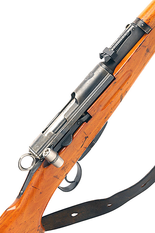 25 1/2in. nitro barrel, block-mounted fore-sight, tangent rear-sight, graduated to 2000 meters, 6 round detachable magazine with matching serial No. leather sling.