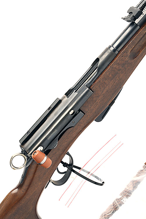 30 1/2in. nitro barrel (bore 7.54 / 7.58), tunnel fore-sight, tangent rear-sight, Anschutz rear aperture sight, removable magazine with matching serial no., leather sling