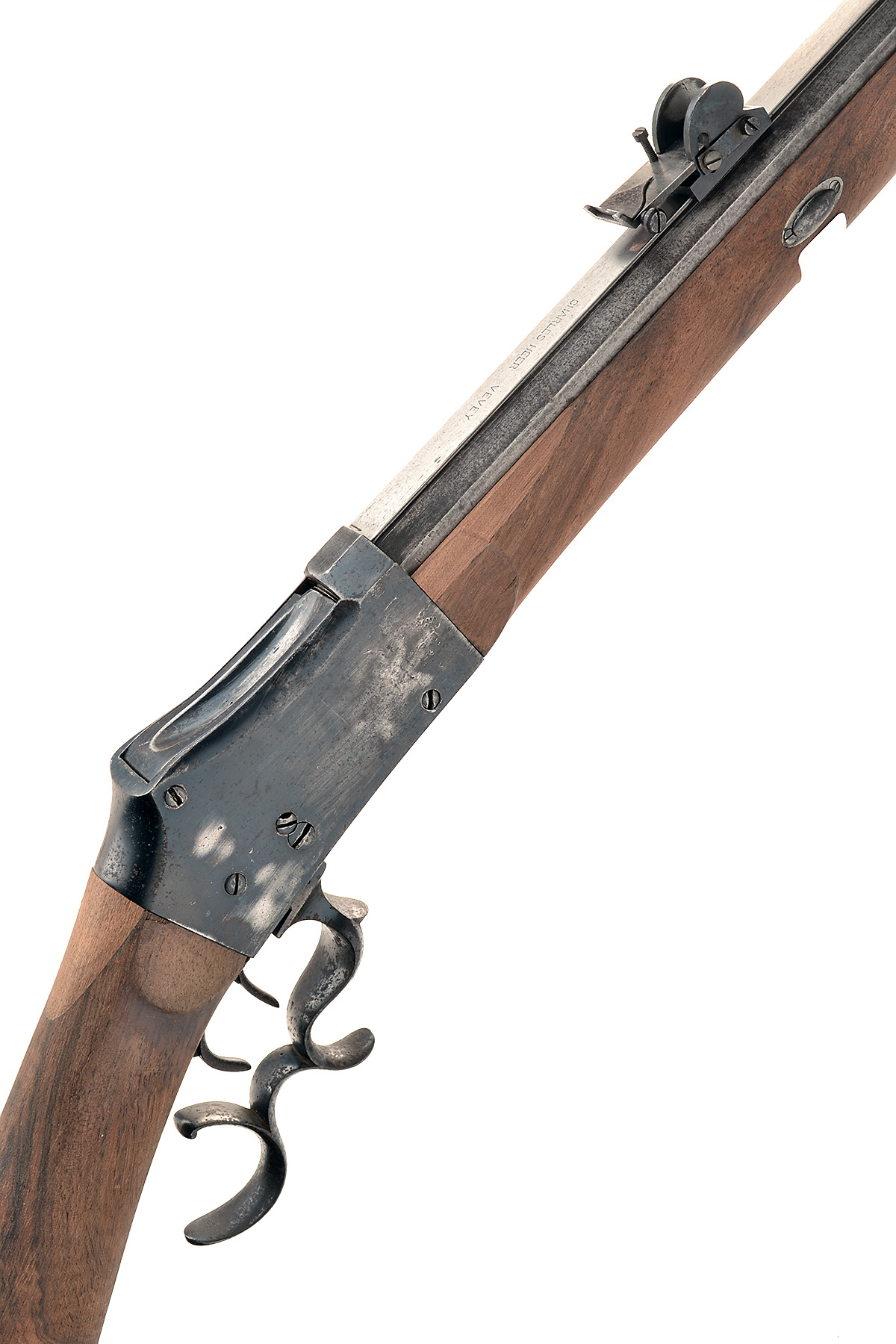 with octagonal 33 1/4in. barrel, adjustable sights, the top-flat signed 'CHARLES HEER, VEVEY', plain action, no provision for peep at wrist, walnut butt-stock stripped of finish and with cheek-piece removed (small inlet repairs), hooked heel-plate, complex trigger guard bow forming the under-lever and walnut fore-end with provision for clearing rod (absent)