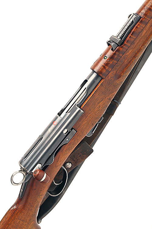 25 1/4in. nitro barrel, block-mounted fore-sight, tangent rear-sight graduated to 1500 meters, 6 round detachable magazine with matching serial no., with 20in. bayonet and scabbard with matching serial no.