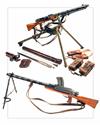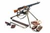 together with a full suite of accessories, with fully fluted 23in. floating barrel (additional spare included) operating within a ventilated shroud, pillar fore-sight with side protectors, elevating tangent rear-sight, integral folding bipod, toggle-action receiver with automatic dust-cover and right hand side mounted detachable box magazine, walnut half-stock with applied full pistol-grip and including issued twin leather sling,, leather barrel case for the spare barrel and bolt assembly complete with cleaning rod, leather neck rig for two magazines, further leather neck rig for four magazines including two spare magazines, sustained fire folding tripod with leather carry-strap, steel mono-pod with leather pouch and anti-aircraft ring sight also with leather pouch