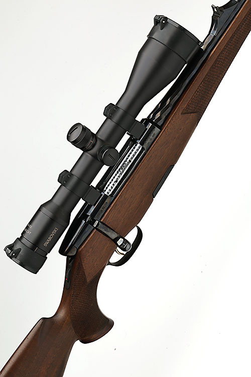 A STEYR MANNLICHER .243 WIN 'LUXUS' BOLT-MAGAZINE STUTZEN SPORTING RIFLE, serial no. 262669, 19 1/2 in. nitro fluted barrel, ramp-mounted blade fore-sight, fixed rear-sight, receiver mounted with a 'SWAROVSKI HABICHT 8x50 HABICHT' with flip-up lens covers, telescopic sight, detachable magazine with two spare magazines, gold-washed set trigger, stutzen pistolgrip stock with sculpted cheekpiece, hogsback comb, sling swivels, 14 in. pull including 5/8in. ventilated rubber recoil pad, with aluminium full-length flight case