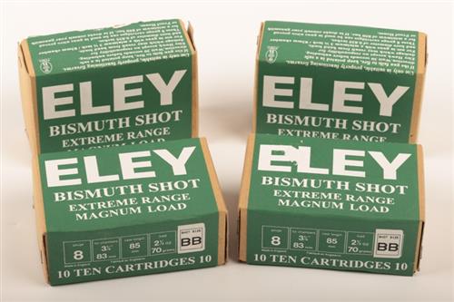 FORTY 8 BORE 3 1/4 INCH NON-TOXIC SHOTGUN CARTRIDGES BY ELEY of recent manufacture using 2 1/2 ounces of Bismuth BB size shot all in their factory boxes of 10 (3 still sealed)