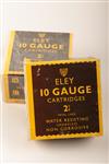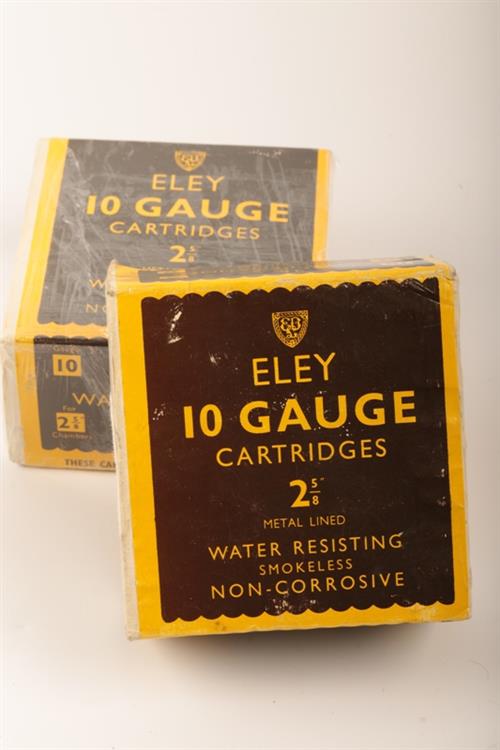 FIFTY VINTAGE AND COLLECTABLE 10 BORE 2 5/8 PAPER CASED SHOTGUN CARTRIDGES BY ELEY in 2 factory boxes both listing the use of 1 3/8 onces of No5 shot