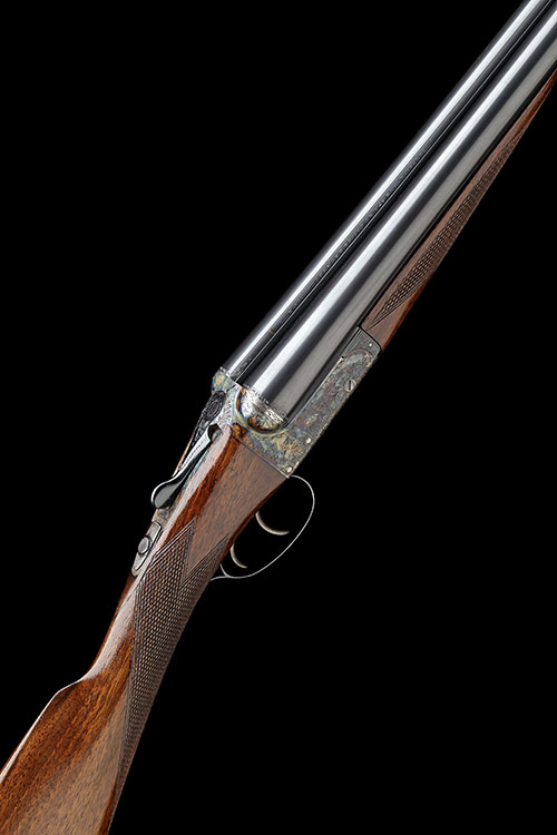 28in. nitro barrels, rib engraved 'WILLIAM EVANS. 67A ST. JAMES'S STREET. LONDON. W.1', 2 1/2in. chambers, bored approx. 1/4 and 3/4 choke, automatic safety, acanthus scroll engraving, the action signed 'WILLIAM EVANS', retaining much original colour-hardening and finish, 15 1/2in. stock including 1in. wooden extension, with gold escutcheon engraved 'M.G.' weight 6lb. 7oz., in its canvas and leather case with William Evans trade label