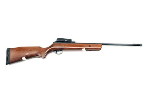 A SCARCE .25 BREAK-BARREL AIR-RIFLE SIGNED BSA, MODEL 'SUPERSPORT CARBINE', no visible serial number, with blued 15in. barrel including an adaptor for a sound moderator, blued air chamber with applied 'Maxigrip' rail and plain beech half-stock, FITTED WITH an electronic sight