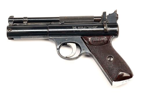 A .22 BARREL-COCKING AIR-PISTOL SIGNED WEBLEY & SCOTT, MODEL 'SENIOR', batch no. 456, with 6 1/2in. barrel, adjustable sights, blued air-chamber and chequered bakelite grips, finish probably renewed