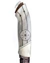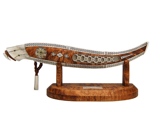 Other Notes: Jonny Walker Nilsson was born on 24th May 1956 and currently lives and works in a small village called Arvidsjaur within Swedish Lapland and inside the arctic circle where he is married and has seven children. Jonny made his first knife in 1988 and has been competing internationally in this art form since 1993, winning many major titles and even having an award for the most beautiful knife in the annual Nordic Championship named after him. Working mainly with reindeer antler and arctic hardwoods, preferring the dense material of shed antler and choosing the other materials according to shape, figure and colouring. The large burls of arctic birch collected by Jonny are dried for at least one year to allow the wood to become stable, and then pieces are often married together using horn, bark or even tinplate spacers. Engraving is Jonny's speciality, and all designs are based on the 10,000 year old sami tradition. Spending at least four hours a day on engraving alone, each freehand engraving cut is performed twice to produce an undercut 'V' shape that is then filled with a powdered bark mixed with a binding agent. Jonny also has his own forge where he produces some magnificent blades, but often works with other bladesmiths such as Mattias Styrefors (as here), Kaj Embretsen, Conny Persson, Gunnar Bergstrom and Peter Ytrebo to create some truly astounding knives. Comprised of 44 individual pieces, a commission such as this would cost in the region of £10,000 today.