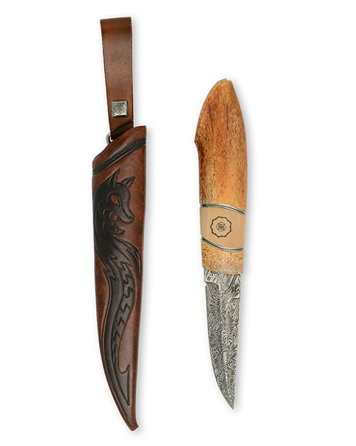 A FINE SPORTING SHEATH KNIFE OF SAMI FORM WITH MATTIAS STREYFORS DAMASCUS BLADE,