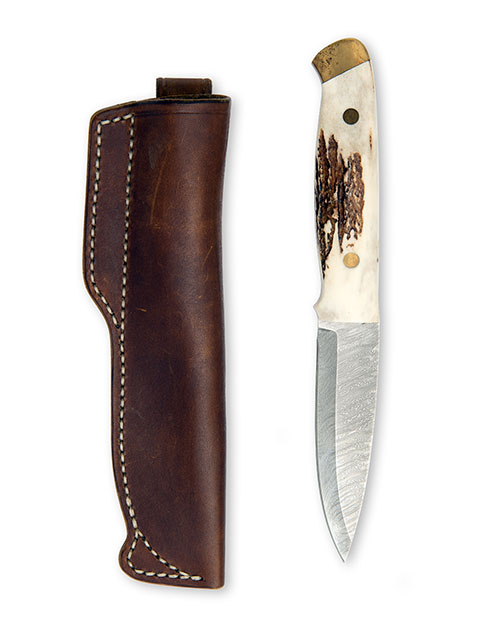 A FINE BUSHCRAFT KNIFE WITH GRAND LEAVITT DAMASCUS BLADE,