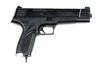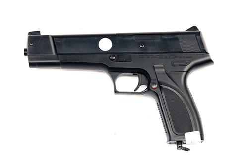 in loose imitation of a semi-automatic pistol with 6in concealed barrel, removable rotary magazine, black plastic slide and frame, black plastic chequered grips, untested but appearing little used
